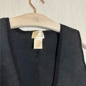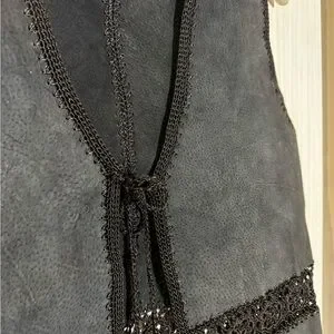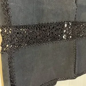 Stylish black sleeveless vest featuring intricate lace detailing. Perfect for layering. Cowhide with tie in the front. Perfect for a country concert or stampede