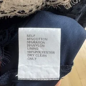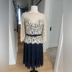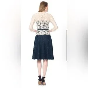 Beautiful and elegant Tadashi Shoji illusion lace dress featuring a cream lace overlay with sheer ¾ sleeves over a navy lining. Flattering fitted waist with navy ribbon detail and a feminine A-line skirt with scalloped lace hem. Concealed back zipper closure. Fully lined.