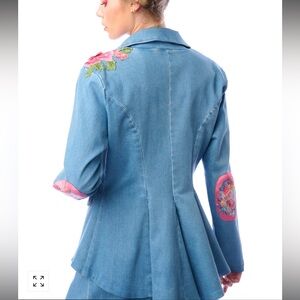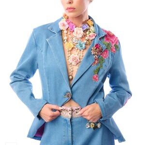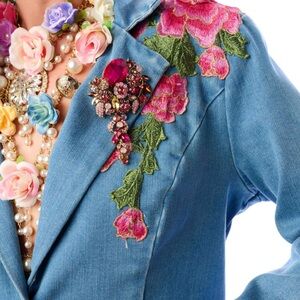 Denim button-up blazer with embroidered floral patch on front & back shoulder, 1 removable floral crystal brooch attached to the lapel, contrast floral elbow patches, 1 crystal button, 1 brass button, 2 flap pockets, satin lining