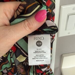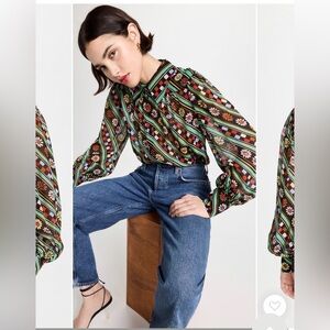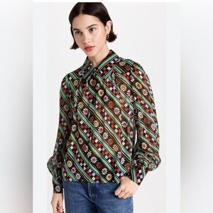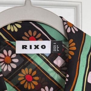 RIXO Blake Blouse Black Retro Stripe Floral Button Down Collar Long Sleeve Shirt