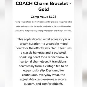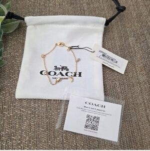 Delicate gold bracelet with Coach signature charms, included a cubic zerconia for an added touch of sparkle. Perfect for any occasion, and an exquisite gift for birthdays, anniversaries, mother's day, daughters day, graduation day, wedding gift, friendship day and many more. This is new with tags and includes the Coach duster.
