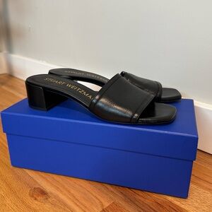 Sleek black leather mules by Stuart Weitzman. Perfect blend of style and comfort.