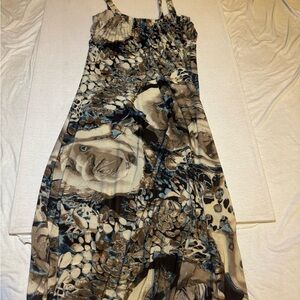 This elegant floral print maxi dress features a stunning blend of black, cream, and brown hues. Perfect for any occasion, it offers a flattering fit and stylish design.