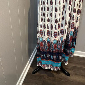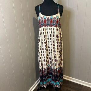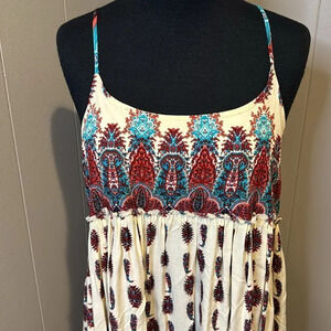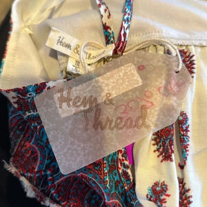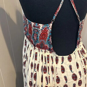 Hem & Thread paisley print open X back gathered skirt raw edge flowy boho style midi. Adjustable straps. Lined bodice. 100% rayon. Size Medium. Armpit to armpit approximately 19 inches. Underarm to hem approximately 43 inches - curved hem. New, with tags. Nonsmoking home.
