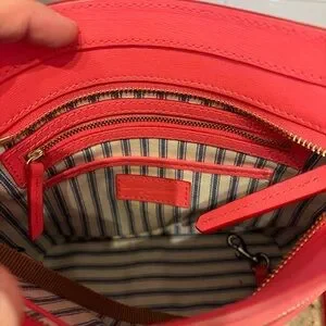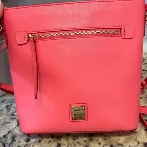 Authentic Dooney & Bourke saffiano leather crossbody in a vibrant coral pink color with gold-tone hardware. This classic small crossbody features durable scratch-resistant saffiano leather, front exterior zip pocket, adjustable strap, and Dooney’s signature striped cotton interior.