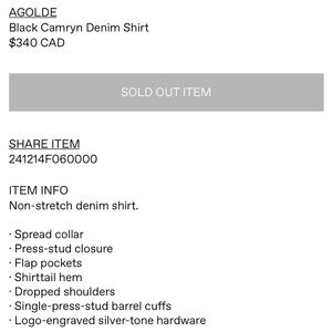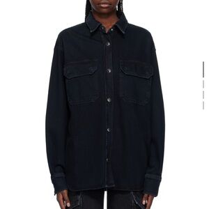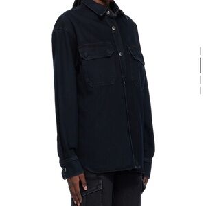 A signature piece, this is is an oversized button-up denim top with flap pockets and elongated long sleeves. It's made with lightweight, non-stretch 100% cotton. This version comes in a dark washed black wash and a clean hem.