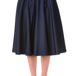 Crafted in an indigo blue stretch denim blend, it offers structure with just the right amount of comfort. An invisible back zipper keeps the look sleek, while the below-knee length adds vintage charm.