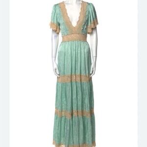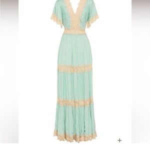 Chic maxi dress in mint with cream lace accents. Flowy and stylish. Ideal for any event.