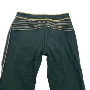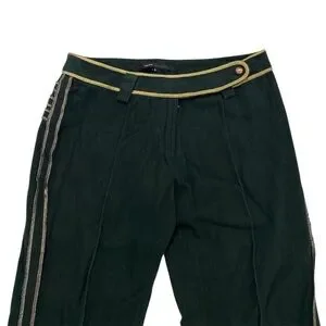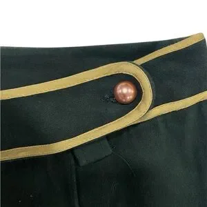 Dark greed trousers with light yellowish goldish trim and stitching, pearl button. In great used condition (no rips or stains). Some normal signs of wear.