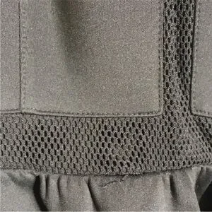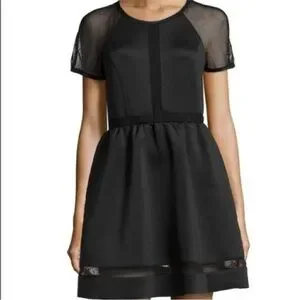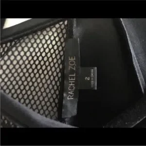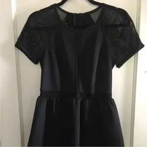 Black scuba fabric with mesh sleeves and detailing. Very comfortable and flattering! Like new condition