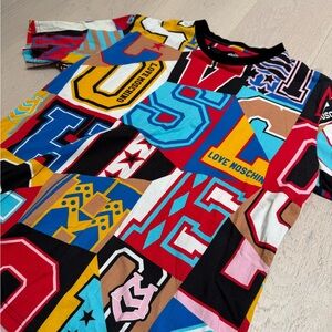 Authentic Love Moschino designer T-shirt featuring bold varsity-inspired patchwork lettering and vibrant colorblock graphics. Statement streetwear piece with oversized logo detailing.