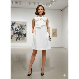 BR Parisian chic Midi lined Sheath Dress graduation Bow Tie Pocket Sz-8 Tall