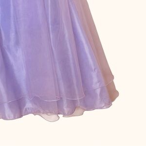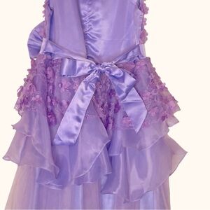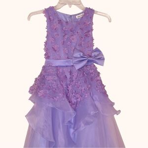 Absolutely stunning lilac formal gown perfect for special occasions! This dreamy ball gown features delicate 3D floral appliqué detailing on the bodice, a soft layered tulle skirt, and a statement waist bow for the sweetest finishing touch. The flowy silhouette creates a true princess look — perfect for birthdays, weddings, pageants, daddy-daughter dances, recitals, Easter, or formal events.
