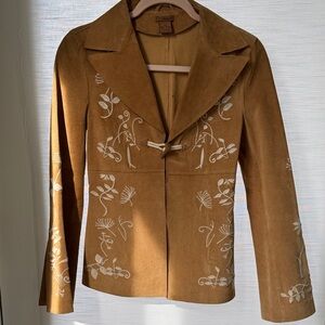 Vintage tan suede blazer with elegant floral embroidery. Features a flared sleeves with a slit and fitted design. One toggle button and 2 hidden closures clasps, if needed. Suede and vintage design are popular this spring 2026!