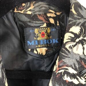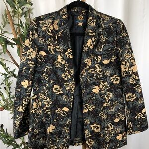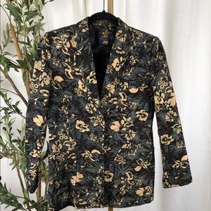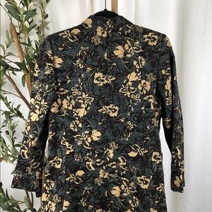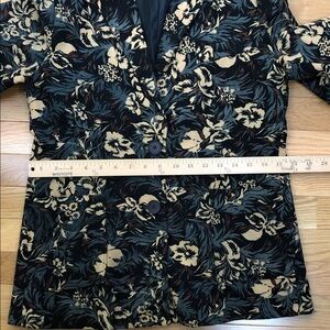 Elevate your style with this elegant floral patterned blazer. Perfect for any occasion, this jacket combines sophistication with a touch of nature-inspired design. Padded shoulders. No size tag but fits like a small/medium. See pictures for measurements. Flares out just a bit at the hips for a feminine silhouette.