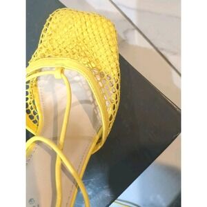 The product is a pair of pre-owned "Mixx Shuz" square toe mesh lace-up cross-tied sandals in size 10. These stylish sandals feature a square toe shape, lace-up closure, and a stiletto heel. The vibrant yellow color and cross-themed design make them perfect for various occasions such as travel, casual outings, formal events, or evening parties during the summer and spring seasons. Made of mesh upper material, these sandals offer a unique and trendy look with a comfortable medium shoe width for women who want to make a fashion statement.