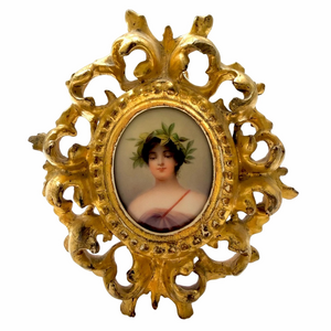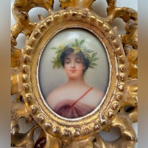 Late 19th century/ early 20th century, hand painted miniature porcelain plaque depicting the nymph Daphne wearing a crown of laurel leaves in a period pierced foliate carved gold gilt wood frame. The oval plaque is approximately 1 7/8” W x 2 1/4” H.