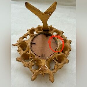 One nail is missing on back. At least 3 pieces of wood have broken off. I have one of the pieces. There is at least one repair where a piece of the frame was glued back on. Lots of paint loss on the frame.