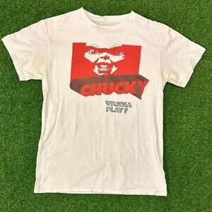 ☆ Features: Classic off-white t-shirt with bold red and black graphic of Chucky’s face, "Chucky" text, and "Wanna Play?" tagline. A must-have for horror fans and collectors.