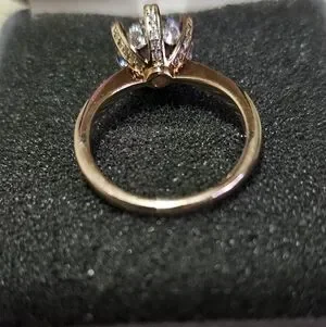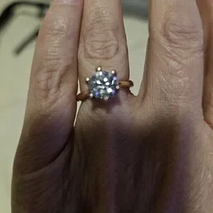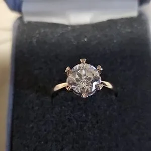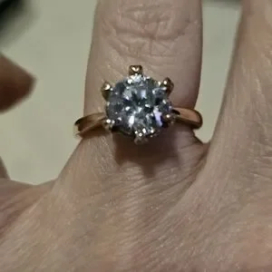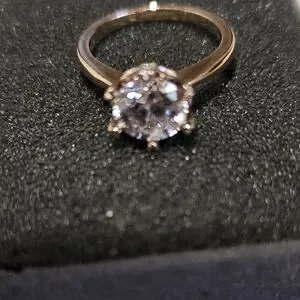 This stunning gold solitaire ring features a brilliant clear stone, perfect for any occasion. Its elegant design adds a touch of sophistication to your style. EUC, size 6. silver with rose gold overlay. purchased years ago.