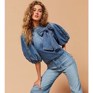 • Machine wash/tumble dry Stylish denim blouse featuring a chic bow detail. Perfect for casual outings.
