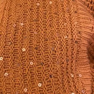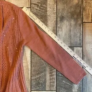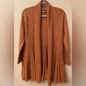 Elegant rust cardigan with textured knit. Open front design. Ideal for layering.