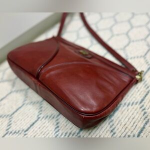 This is a vintage Etienne Aigner Oxblood Leather Flex-Frame Shoulder Bag with a classic design. It features spring hinges, a medium size, single strap. Interior lining with signature branding and the outside has the brand’s iconic horseshoe.