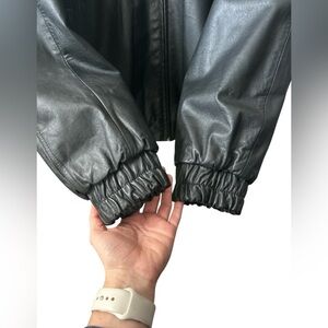 Oakton Ltd. Black leather bomber jacket. Two hand pockets and functioning zipper. Fully lined and no rips on the lining. I found tiny spots where it has peeled (see photo- I had to zoom way in) the peeling is a little bit bigger than a grain of salt. Men’s large: 23 inches pit to pit and 27.5 inches shoulder to hem.
