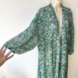 Floral duster in sheer fabrication w/ metallic threading throughout.