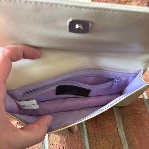 Add a touch of Y2K minimalism to your wardrobe with this chic Liz Claiborne baguette shoulder bag. This classic off-white/cream piece features a stunning surprise: a vibrant lavender purple satin lining. It’s the perfect "clean girl" aesthetic accessory for brunch, weddings, or everyday styling.