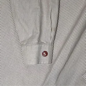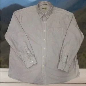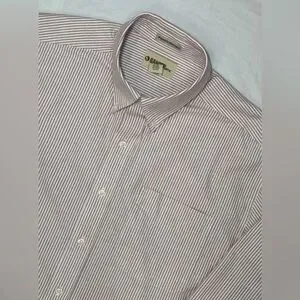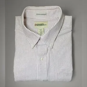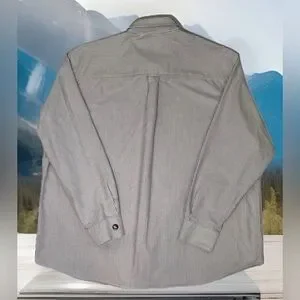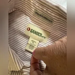 The Gander Mountain Men's Button Down Long Sleeve Casual Shirt is a versatile and classic wardrobe staple for men. Made of 100% woven cotton, this shirt is perfect for all seasons and occasions, from casual outings to business meetings. The maroon and white striped pattern, collared neckline, and button-down style add a touch of sophistication and style to the everyday. With accents like a front pocket and logo on the sleeve, this shirt is both practical and fashionable, making it a perfect choice for the modern man on the go. Size XL, measuring 56" around the chest and 31" neckline to hemline. Color is closest to seconds picture. Feels super high quality and is in excellent condition.