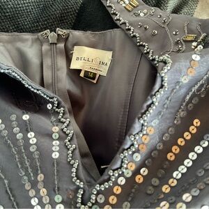 Elegant Bellissima Fashions evening dress in a soft grey tone, featuring intricate bead and sequin detailing throughout. Crafted with a lightweight chiffon overlay and fully lined for comfort and structure.
