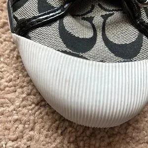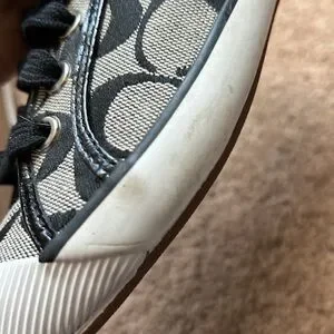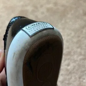 Super cute Coach shoes. Black patent leather back and purple sequins. Signature Coach canvas.