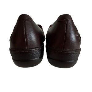 Hush Puppies Brown Leather Wedge. Step into casual sophistication with these brown loafers from Hush Puppies. Crafted from smooth leather, they feature intricate floral leather embroidery and a cushioned insole for all-day comfort. The slip-on design and precise stitching make them a stylish choice for any relaxed occasion. Color: Brown. Material Leather Upper. Size 9.5 Narrow. Man made Wedge Sole. New without box. Pet free smoke free environment