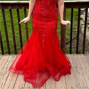Stunning red prom dress by Camille La Vie. Features intricate detailing and a flowing skirt.