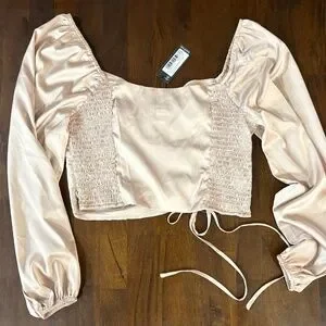 Beautiful champagne-colored satin long-sleeve corset-style top with ruched detailing on the front. US size 8