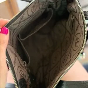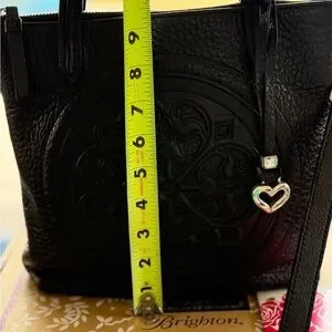 Brighton’s “Soft Lara Tote” from their beautiful Ferrara Collection, no longer made by Brighton! The bag can be worn as a crossbody with the lengthy, adjustable strap, or you can remove that and carry with the handles only. I usually alternated between the two and found this to be quite convenient! I’m including the little rhinestone charm on the heart emblem! Solid black with dark grey interior lining which includes two interior zipper pockets, plus two open pockets, and an additional open pocket on the back perfect for a large phone. I got the long strap caught on something at a boutique and it broke, so I took it to Brighton for repair and a professional, deep, leather cleaning. This was one year ago, and I never carried it again. The leather has softened a bit, interior is nice and clean, no visible stains, marks, or scratches on the leather. It is in great, pre-loved condition. I have been gravitating towards a smaller organizer crossbody bag from this same, exact collection! Will ship in original box and packing materials, dust bag, original tag, and photos only of original receipt and also receipt for the repair and cleaning.