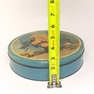 Originally used for candy, this tin now makes a lovely decor accent or storage piece for keepsakes, sewing notions, letters, or ephemera. Beautiful styled on shelves, hutches, coffee tables, or gallery displays.