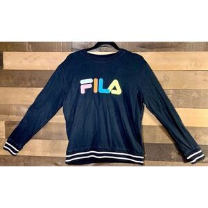 Colorful FILA applique logo. Long sleeve. Sleeve and Hem Stripe banding detail Excellent condition. Little to no fading.