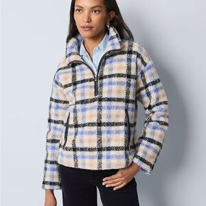 Stay cozy and stylish with this plaid Sherpa jacket. Featuring a blend of cream, blue, and black, it's perfect for any casual occasion.