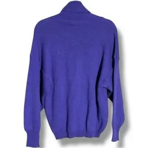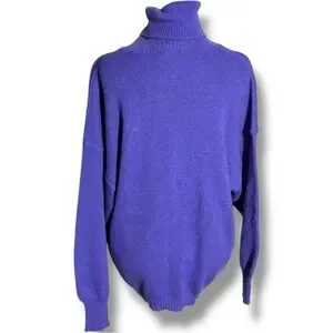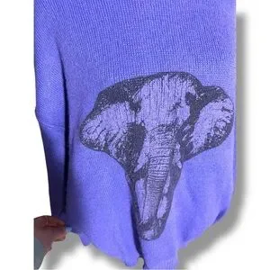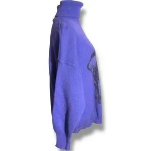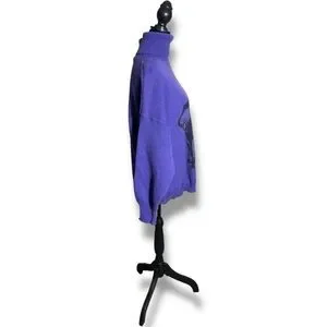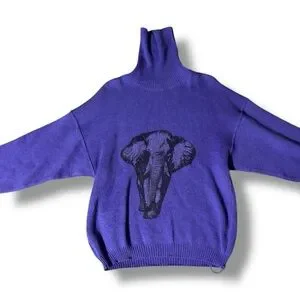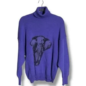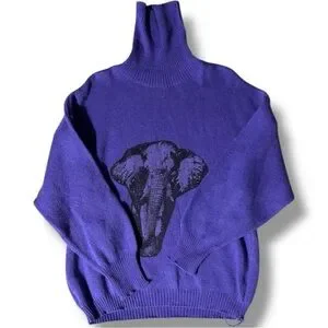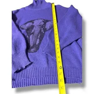 Great pre-owned condition, little to no wear; Royal purple with black graphic Elephant face featured on front, ex Long Turtleneck for versatility, made with wool and acrylic, vintage Turtleneck sweater