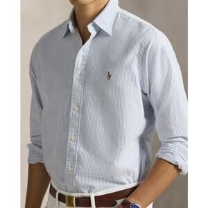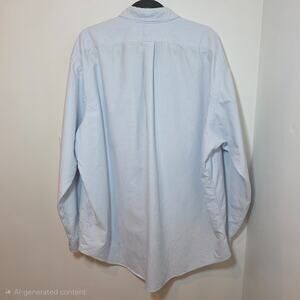 The Polo Ralph Lauren Blue White Striped Oxford Shirt in size XXL is a classic and stylish button-up shirt designed for men. Made of cotton with a woven fabric type, this shirt features a collared neckline with a button-down style, making it perfect for casual occasions year-round. The shirt has embroidered accents and the iconic Polo Ralph Lauren logo, adding a touch of sophistication to the timeless blue and white striped pattern. With a chest size of 58 inches and a fit that is tailored for a regular size, this shirt is a versatile and essential piece for any wardrobe.