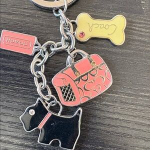 Stylish Coach keychain with dog, bone, and bag charms. Features silver, pink, yellow, and black accents.