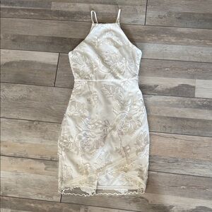 Chic off-white mini dress with floral lace overlay. Perfect for elegant outings. Features a halter neckline and fitted silhouette.