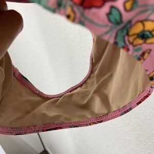 Color: Pink background with multicolor floral print in red, yellow, green, and purple.