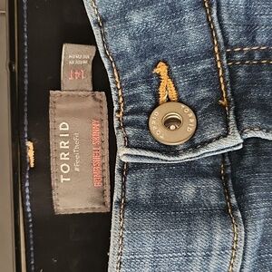 Popular Torrid high-rise bombshell jeans in a 14T. These do have a small spot (possibly ink) in the inner thigh area that I have not tried to remove...see photo.