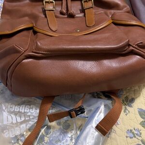 This backpack is soft leather. Good for a college student, work bag or travel bag. It has a lot of space and many pockets.