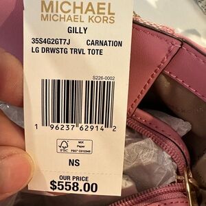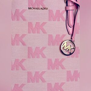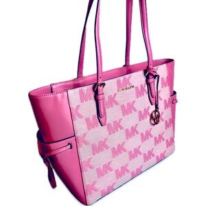 Large drawstring Carnation Tote bag. Monogrammed MK, zipper closure. Excellent, New With Tags.