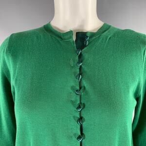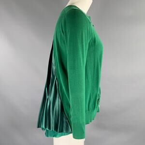 Sacai Luck SS 2014 Cardigan, crafted in Japan, features a vibrant green cotton knit body. A unique contrast polyester back panel and button detailing add a contemporary, experimental touch to the classic silhouette.