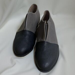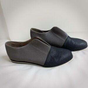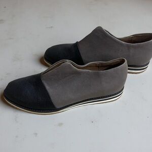 Step out in style with these chic two-tone loafers. Featuring a sleek black and gray design, these leather flats offer both comfort and edge for every outfit. Like new condition!